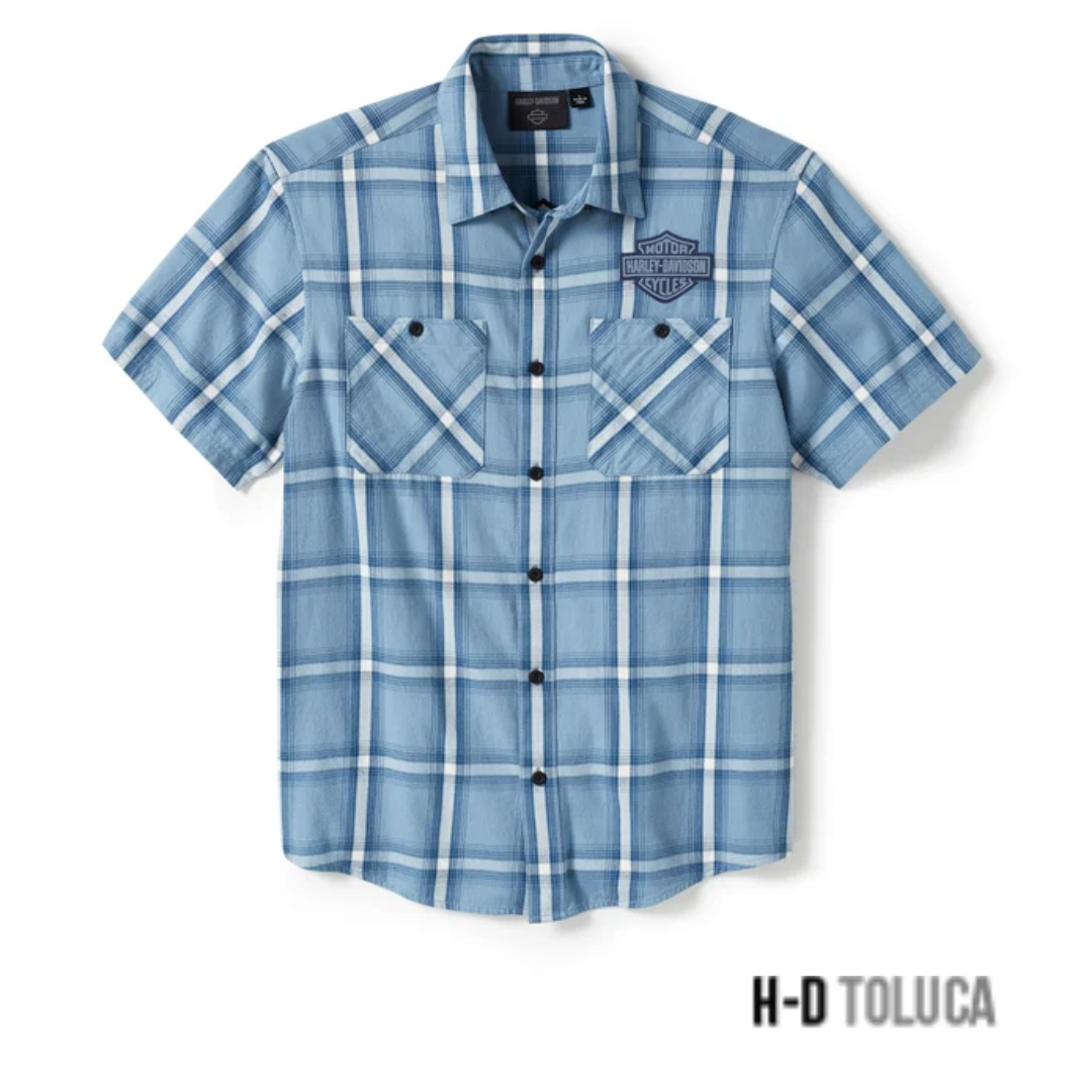 Dale un toque especial a tu look de cuadros escoceses con nuestra Bar & Shield Staple Short Sleeve Shirt. Confeccionada en sarga de algodón resistente y permeable al aire para ofrecer una comodidad duradera. Esta prenda abotonada tiene un compartimento para un bolígrafo y un cuello con broches a presión ocultos para que no aletee mientras conduces. Tiene nuestro icónico logo Bar & Shield en la parte delantera y un look Harley-Davidson clásico en la espalda.
