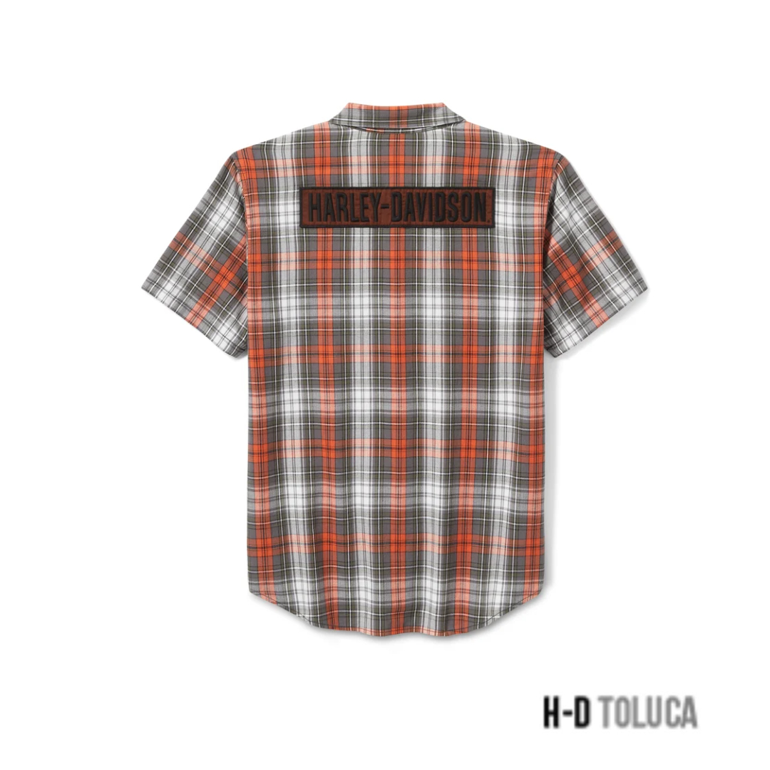 Luce un look impecable sin renunciar a tu estilo de motociclista con nuestra Camisa Block Font Yarn Dyed Plaid Esta prenda de sarga de algodón liviana, duradera y respirable ha sido sometida a un proceso de lavado para darle un aspecto desgastado. Esta camisa abotonada de mangas cortas para hombre tiene un dobladillo redondeado que luce muy bien fuera o dentro de los pantalones, un práctico compartimento para bolígrafo en el bolsillo izquierdo del pecho y un cuello con broches a presión ocultos para que no aletee mientras conduces.