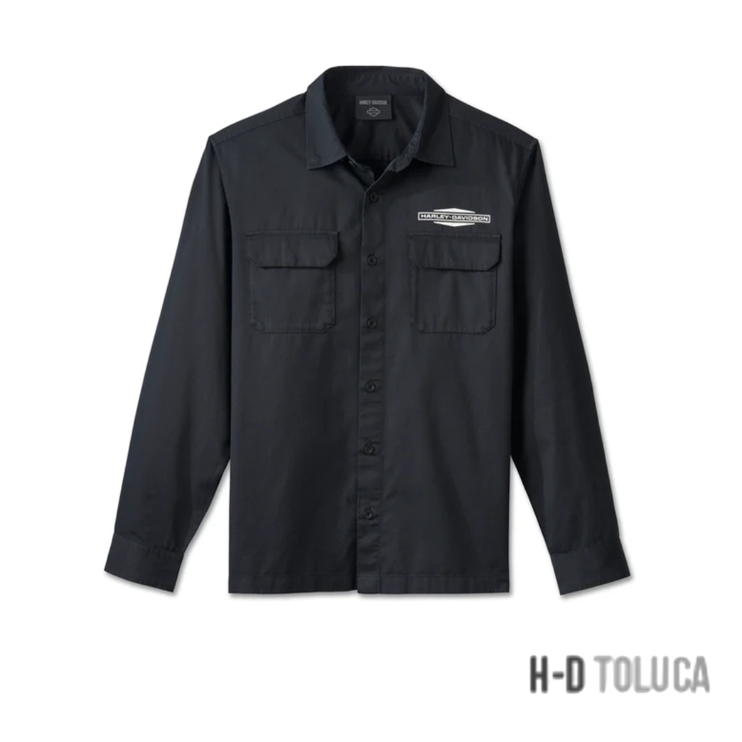 Te verás bien y honrarás nuestro legado motociclista con la camisa de manga larga Mechanics de Wrench Crew. Confeccionada con sarga de algodón liviana pero resistente que se lava para lograr suavidad y una sensación de uso. Esta camisa abotonada para hombre tiene bolsillos con cierre a presión y un cuello con cierre a presión oculto que no se mueve debajo de tu equipo de motociclismo. Nuestros gráficos son sutiles en el frente y completos en la espalda para una apariencia que es inconfundiblemente Harley-Davidson. Conoce la historia: el logotipo Bar & Shield apilado que aparece en esta camisa se remonta a 1963, cuando se extendió horizontalmente para adaptarse mejor a nuestros tanques de gasolina de motocicleta.