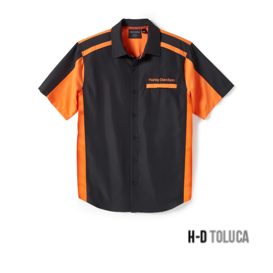 Mantente fresco y seco con la H-D® TECH Quick Dry Shirt. Este diseño de ripstop y malla de poliéster absorbe la humedad y se seca rápidamente, mientras que su estilo atractivo y contrastante, y sus gráficos le dan un aspecto H-D más moderno. Esta prenda abotonada de mangas cortas tiene un bolsillo con cremallera para llevar tus elementos esenciales y un cuello con broches a presión ocultos para que no aletee mientras conduces.