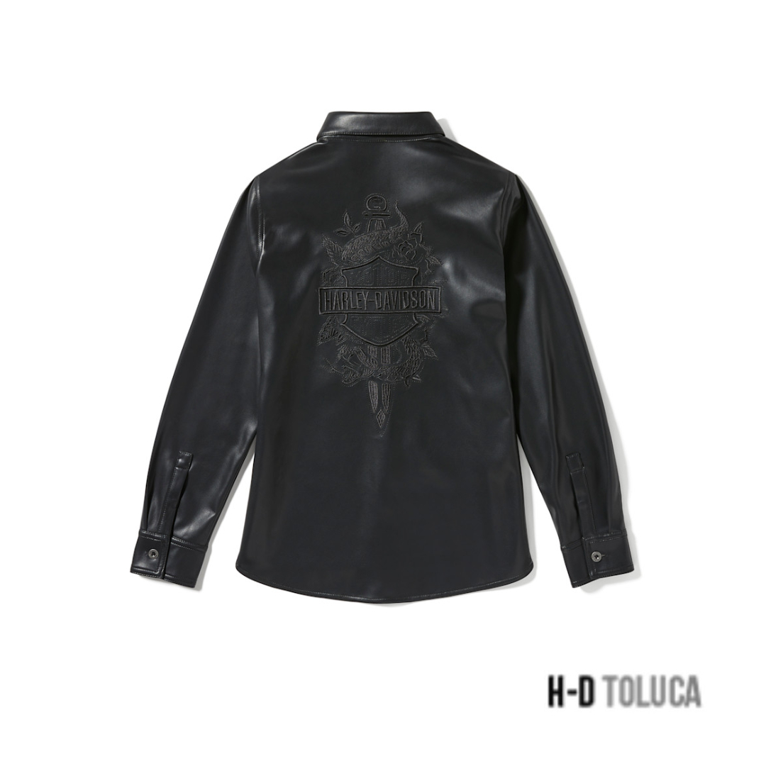 El estilo rebelde de motociclismo es sencillo y está de moda en nuestra Camisa Metallic Dagger Faux Leather. Está confeccionada en cuero sintético de poliéster pesado que es duradero y más fácil de cuidar que el cuero real. Esta prenda abotonada de mangas largas para mujer tiene un dobladillo redondeado con aberturas laterales altas para facilitar el movimiento.