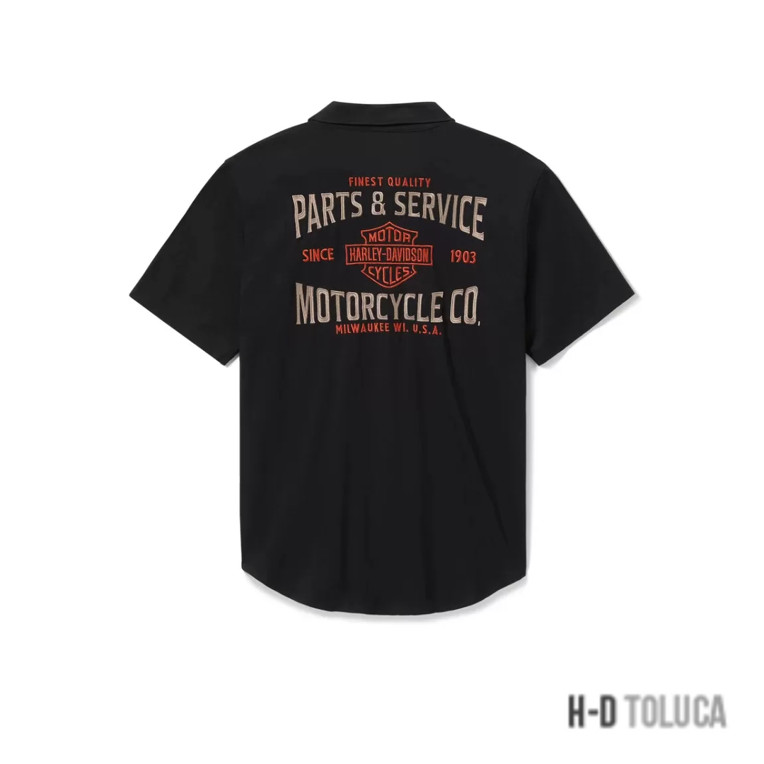 El estilo inspirado en la ropa de trabajo se combina con la comodidad de larga duración en nuestra camisa de jersey Parts & Service. Está confeccionada en jersey de algodón transpirable, lavado para mayor suavidad y un tacto desgastado. Esta camisa de manga corta para hombre presenta un dobladillo que queda genial por dentro o por fuera, además de un cuello con broches ocultos que no se mueve bajo la ropa de moto. Está rematada con gráficos bordados personalizados inspirados en nuestros archivos que rinden homenaje a los profesionales que nos impulsan en la carretera.