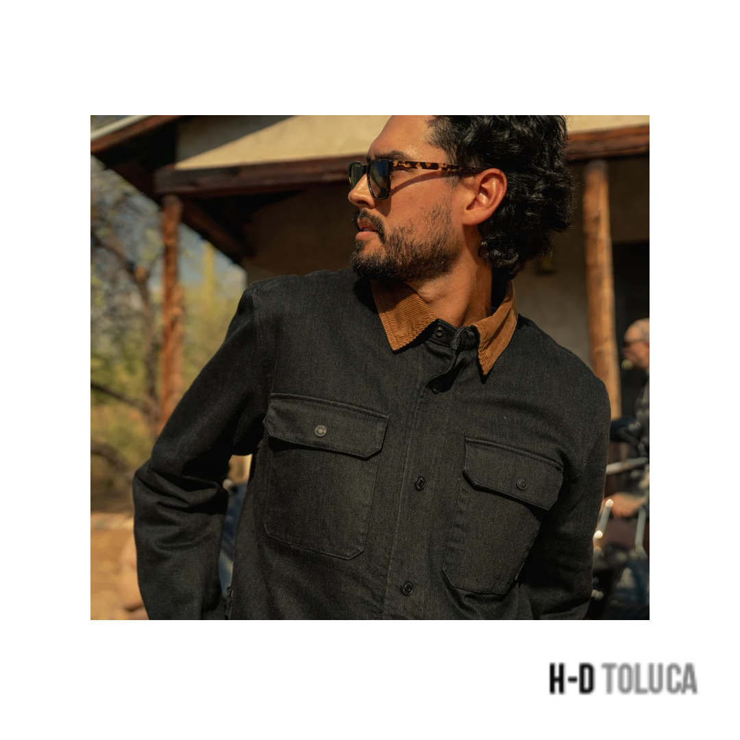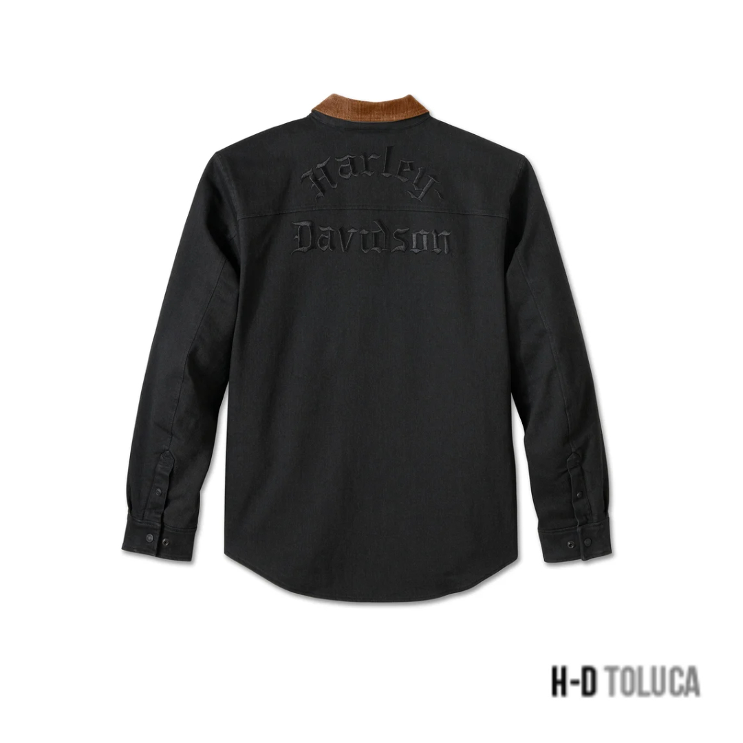 Conduce más abrigado y más protegido con nuestra H-D Sherpa Operative 2.0 Riding Shirt Jacket de edición limitada. El denim pesado y elástico de algodón/nylon/lycra acompaña tus movimientos, mientras que el forro de sherpa y el relleno de poliéster de las mangas brindan un mayor aislamiento. Cuenta con la protección superior contra impactos de D30 Ghost Armor en hombros y codos y tiene broches a presión ocultos bajo el cuello de corderoy en contraste para que no aletee mientras conduces. Esta chamarra de motociclismo tiene material reflectante para mejorar la visibilidad y un bolsillo derecho con cremallera para guardar tus objetos personales.