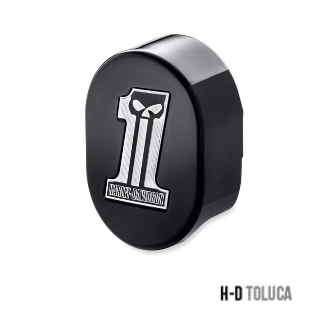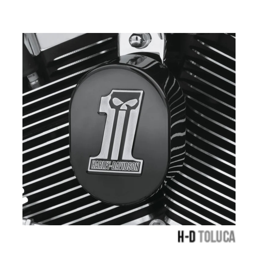 El famoso logotipo Harley-Davidson® #1 con un giro siniestro. El aspecto complementa otros accesorios de la colección Dark Custom™, o es un complemento perfecto para una conducción completamente oscura.