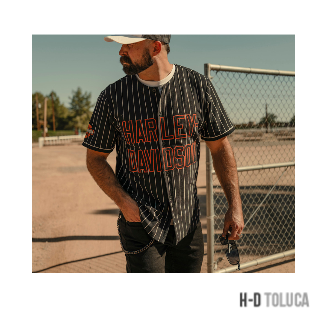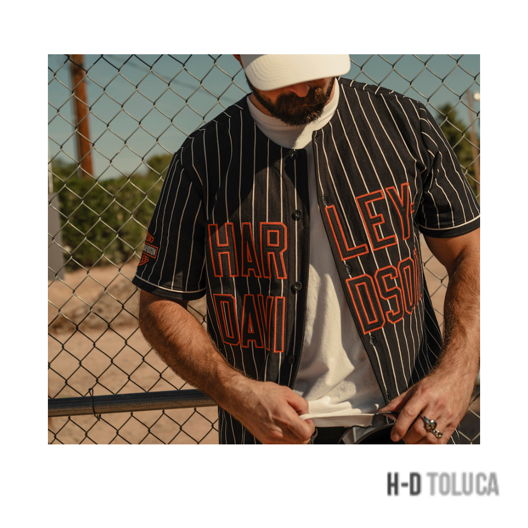 El jersey H-D® Essential ’03 Baseball tiene un diseño deportivo inspirado en el béisbol. Esta prenda, confeccionada en tejido jersey de algodón grueso con rayas finas, combina durabilidad y transpirabilidad, incorporando un cierre frontal con botones de la marca.
