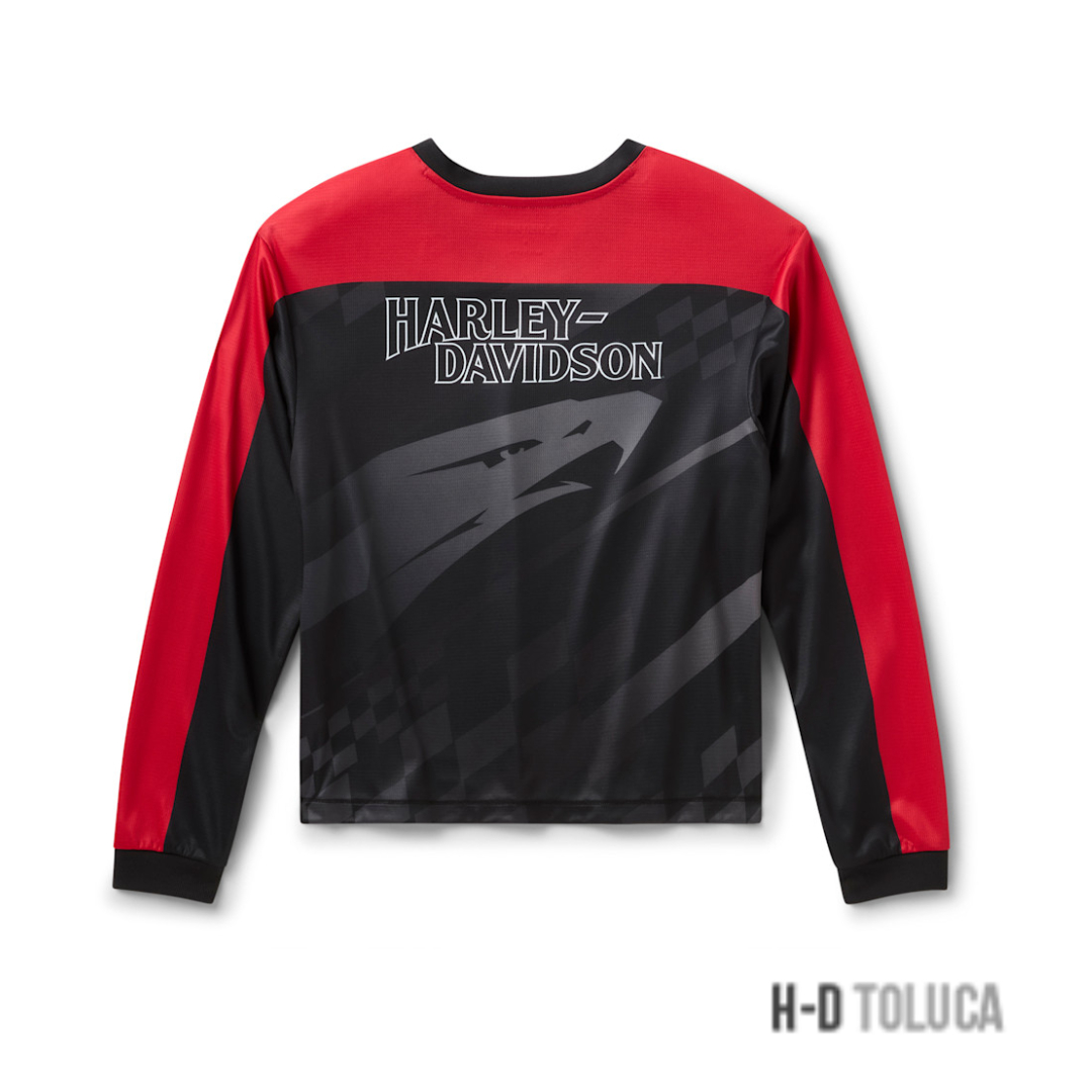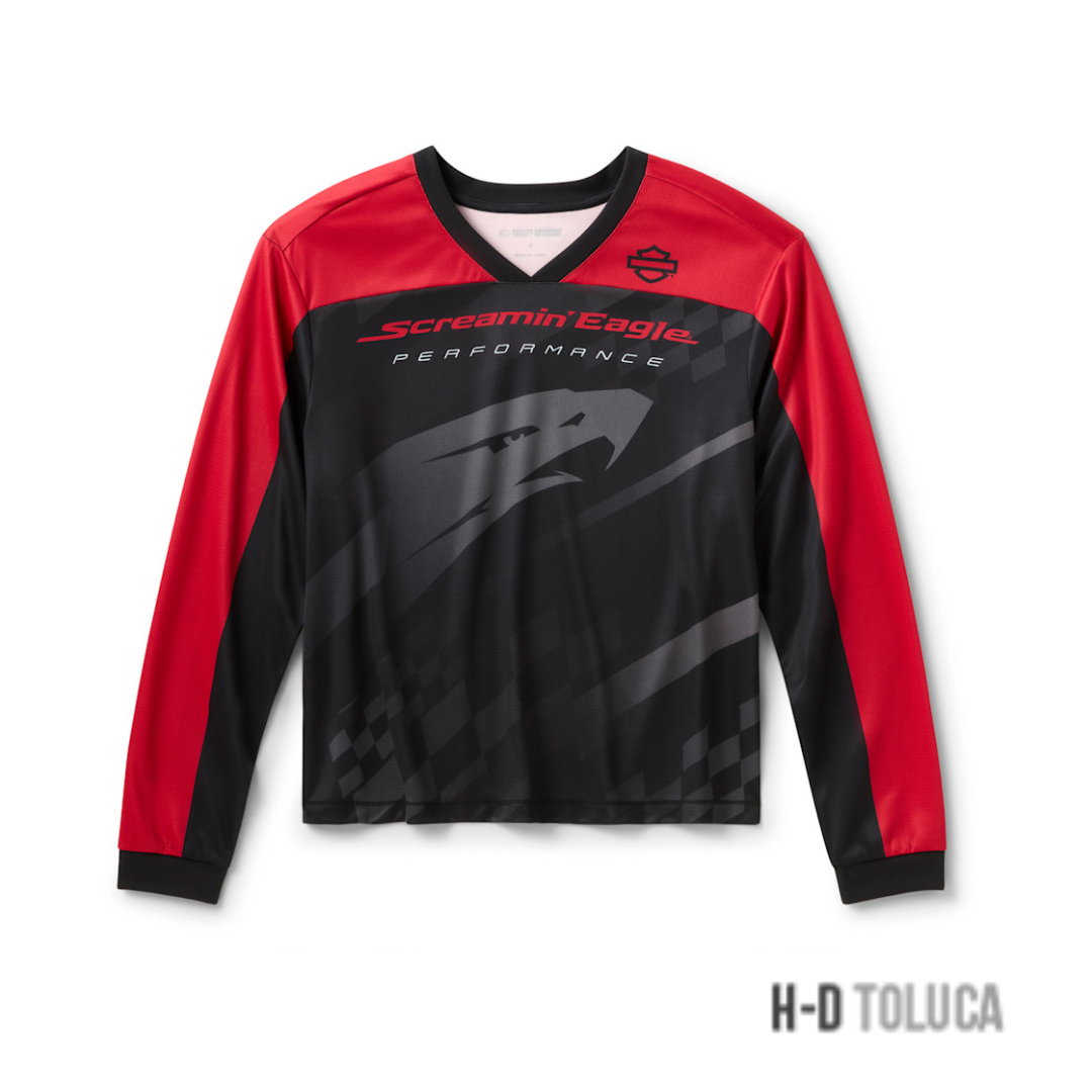 Con nuestro jersey Screamin’ Eagle® Race llega el estilo creado para los fanáticos del flat track. Esta prenda, confeccionada en tejido de malla con diseño de nido de abeja de poliéster, favorece la ventilación y la comodidad, mientras que el punto acanalado permite mantener la forma.