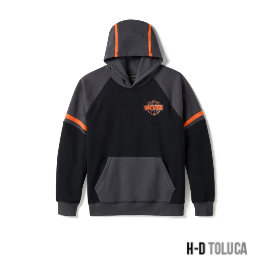 Una prenda cómoda con el audaz estilo de HD en nuestra Iron Pride Colorblock Pullover Hoodie. Diseño de tela polar de algodón/poliéster de ajuste holgado con un amplio bolsillo tipo canguro y una capucha superpuesta forrada en jersey. Las rayas y los recortes en contraste que se sincronizan con nuestro logotipo más icónico mejoran el aspecto de este pulóver.