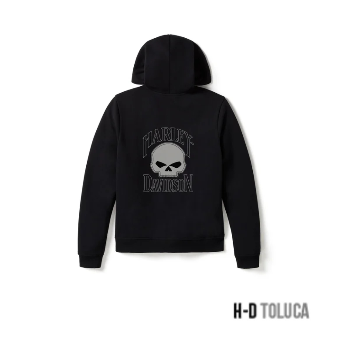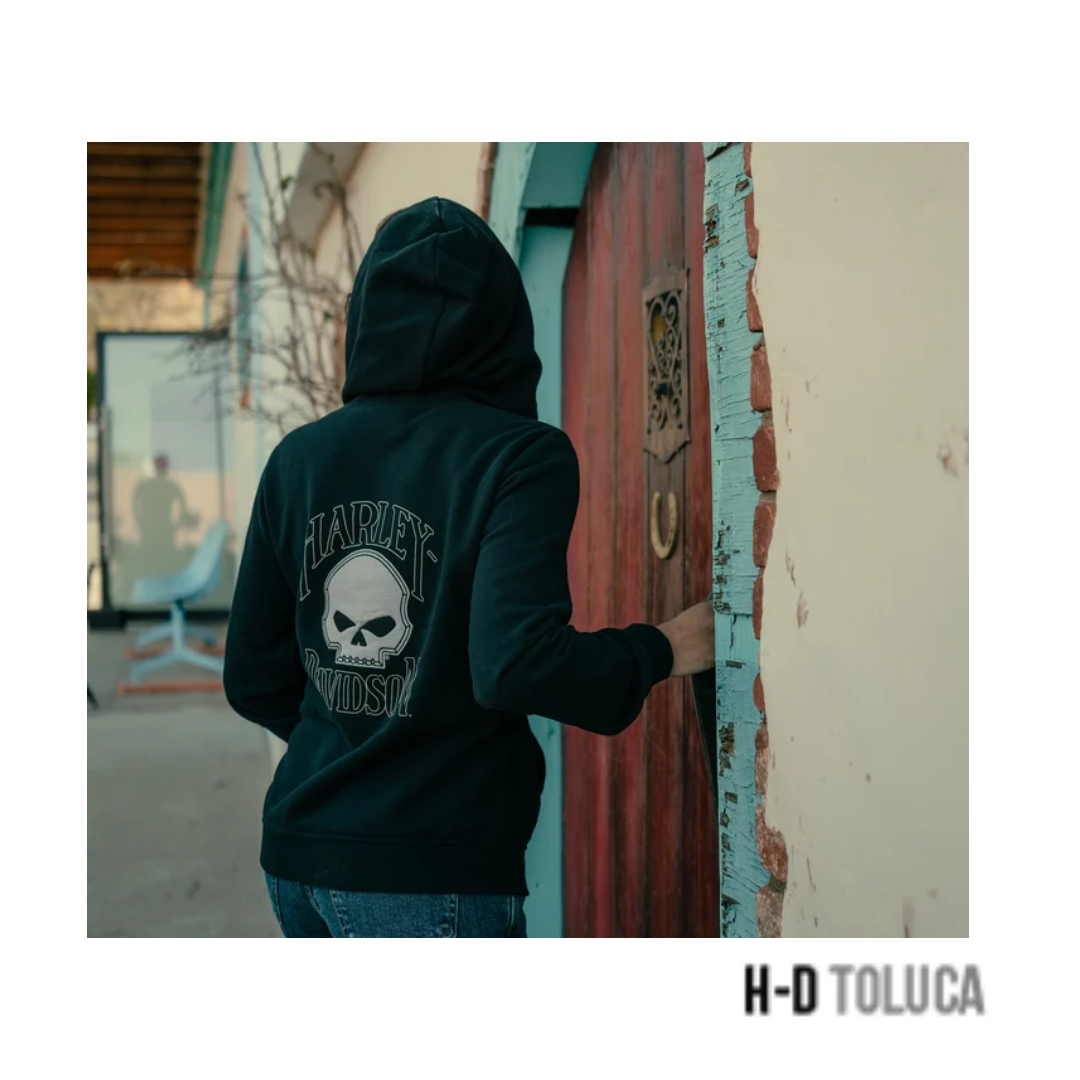 Muestra tu look con el creativo legado de la Willie G™ Skull Full Zip Hoodie. Esta sudadera con capucha y cremallera para mujer, confeccionada en tela polar de algodón/poliéster ofrece mayor comodidad y un corte relajado. La capucha forrada en jersey tiene aberturas dobles para pasar el cordón de ajuste y que no aletee cuando conduces.